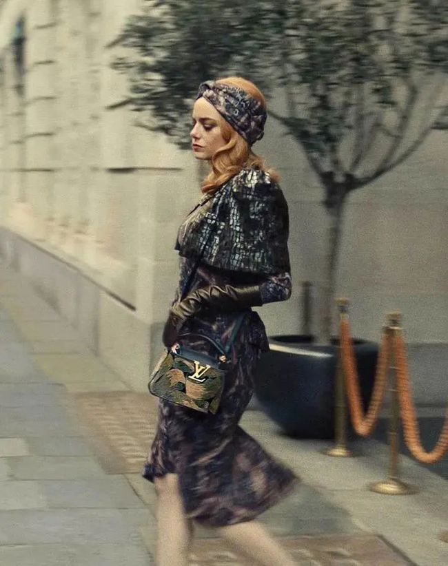 This scene appeared in the movie for only 3 seconds, but it doesn’t prevent us from remembering it. Cruella wore a silk-textured and slightly elegant printed dress, which was very different from her previous punk style. A classic LV bag slung on her shoulder, which puts on the touches to her look, as if she was hiding her identity as a thief. With a silk scarf on her head, the femininity immediately rose. The overall shape is very coordinated, this Cruella looks like a a noble lady.