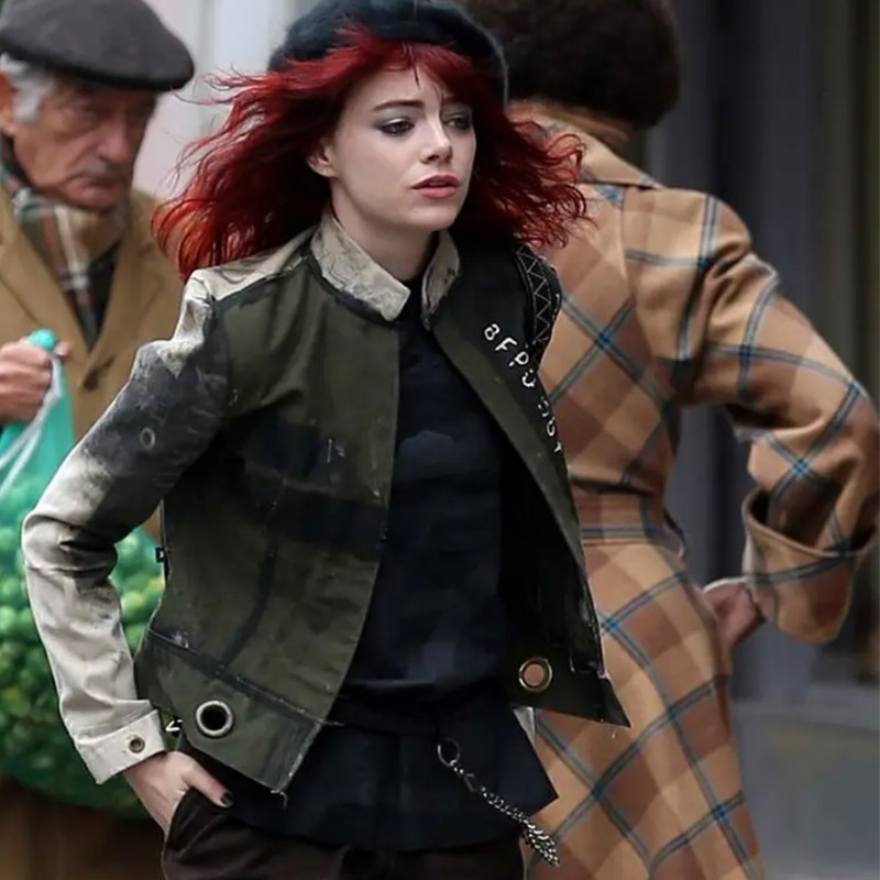 This is the old-fashioned jacket Cruella wore when he first saw the vintage shop boss who became her friend and partner in the future. The front of the jacket is army green, the back is off-white, and the fabric uses distressed canvas, Which fits well with her avant-garde mix& match, splicing, and collision wear as the main punk style. The black beret on her head adds a lot of literary style to the overall shape.